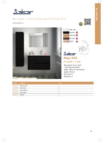 MOBILI BAGNO - 01 Base 2 cestoni + 1 anta con lavabo e specchio filo lucido - 85 cm H 56 cm P 46 cm Codice Colore CFZ 03165713 Bianco Lucido 1 03165714 Nero Satin 1 03165715 Rovere Africa 1 03165716 Noce Maya 1 03165717 Natural 1 49